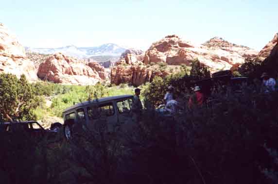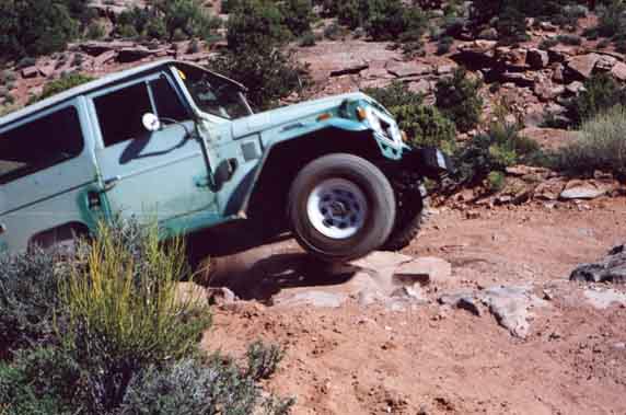 You can't see it from this angle, but there is a precipitous drop-off (cliff) on the passenger's side. Screw up and you roll a loooong way. Following Rich is Todd Oldenberg in his 1985 BJ70, and at the top of the hill is Bruce and Heather Westlund in Bruce's 1968 '40, "Jethro".