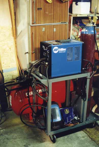 (later in the project) Here's a shot of the Miller welder I got. It came in handy when I had to weld up that crack in the exhaust manifold of the '71! Soon it will be getting duty on sheet metal too. I also used it to weld up the broken chair from the dining room, and weld up a 1" crack in the driver's side fender. Still need more practice!!!