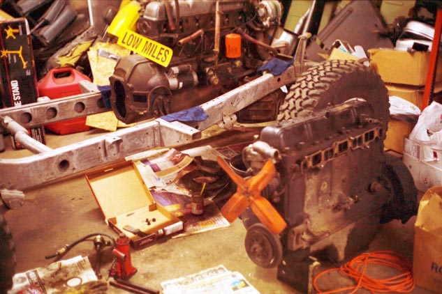 In these shots, you can see the old F engine from Charlotte setting on the garage floor next to the naked frame of the 76. The "Low Miles" sign came from Stevinson Toyota; Rising Sun meetings were held in their conference room, and occasionally they had some leftover sales souveniers for us. I thought this one would be kinda humorous.