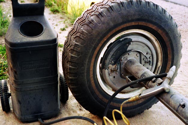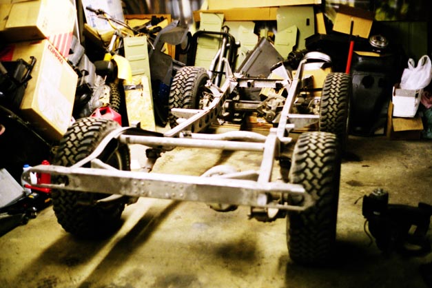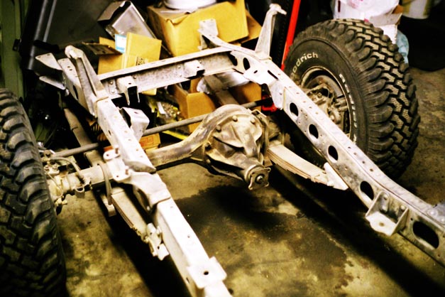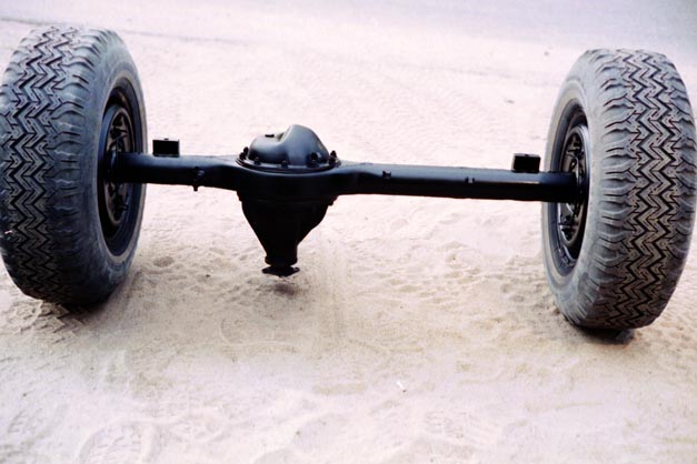 Next up is the axle housings. After 5 coats of paint on the frame, I removed the old suspension and put the frame up on four jackstands, then rolled the complete axles out to sandblast them prior to paint. I decided to leave them intact for now. The is really no difference in how hard it is to replace seals and bearings and such whether they are installed or not, so I simply left them to avoid getting sand and gunga inside while I blasted and painted.