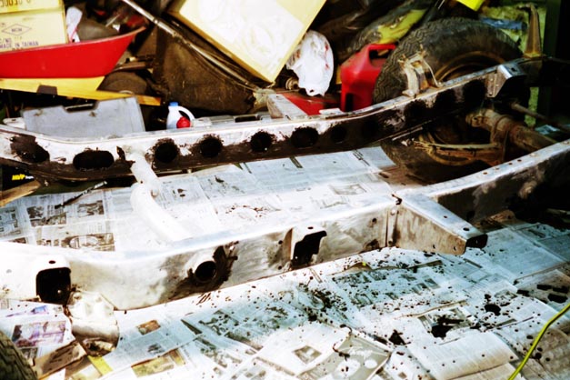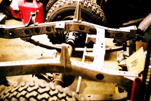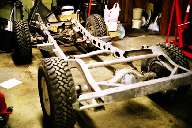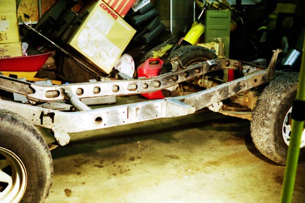 I used the last couple shots left from photodocumenting the engine swap to take these shots of the naked frame. At this point in time, January 2001, sanding was complete, and sandblasting was more than 90% complete. There were still a couple spots up in the front around the frame horns and front crossmember that were still left to shoot. Once the engine was installed in Charlotte and the cherry picker could be used to pull the 2F back out of the way, it was simply a matter of having decent weather, and enough light left on evenings and weekends. Seems like the good weather would always be on days that I had to work, then it would snow on weekends. But it did get done, just took a lot of perserverance.