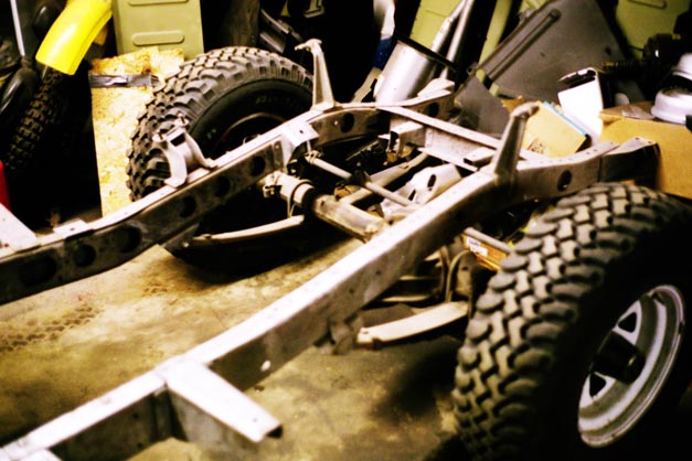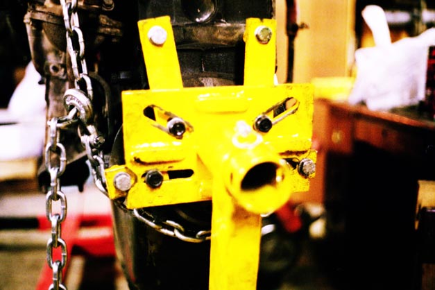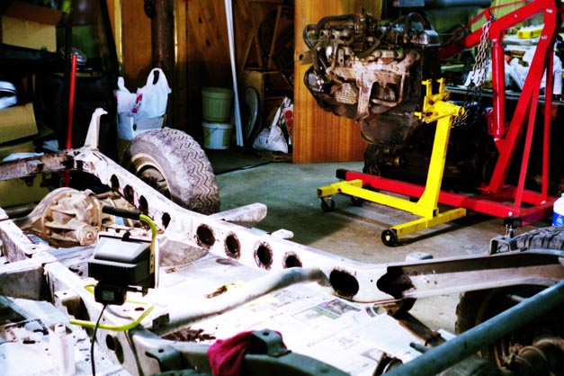 I had been using the cherry picker to hoist the engine up out of the frame, then roll the chassis out to the driveway to sandblast the frame (in many sessions), then roll it back into the garage. Needing the cherry picker to swap the Fs in Charlotte, I used the chassis as a convenient spot to store the 2F while the cherry picker was being used.