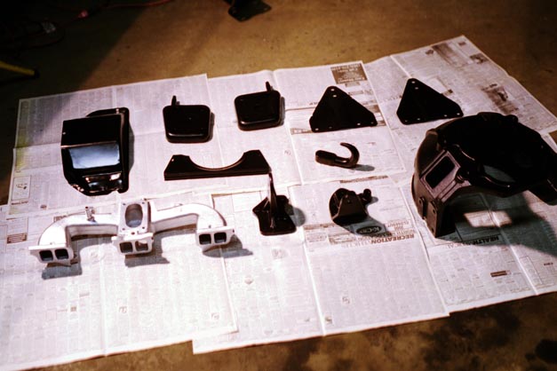 During this time I also sandblasted and painted lots of odds and ends that had been removed thus far. U-bolt plates, frame horn gussets, bellhousing and dust cover, tow hook and engine mounts were done. The shiny intake manifold you see is actually the original one from Charlotte, I like parts that have been cleaned and painted like new!