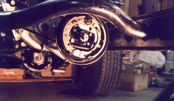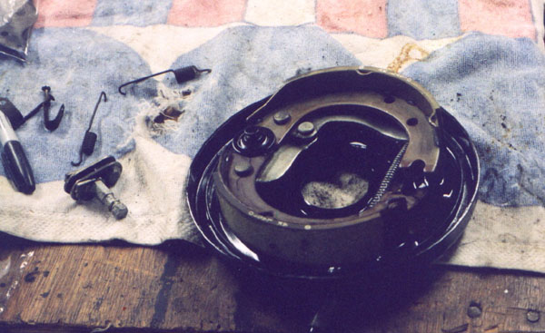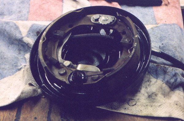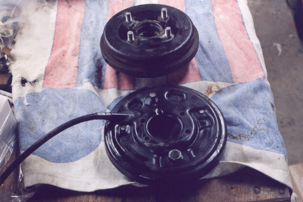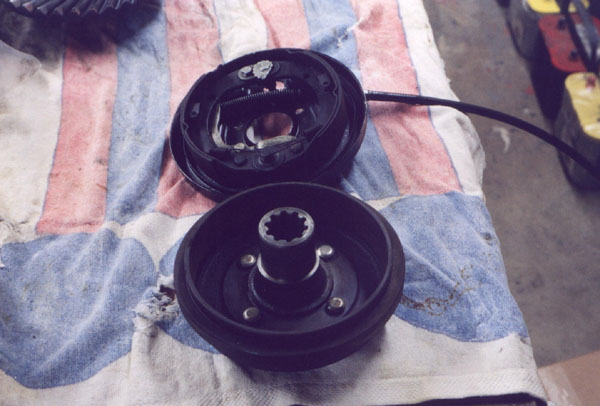 The two photos below show front and back of the parking brake backing plate with shoes and hardware, and the drum itself.