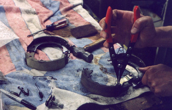 The same c-clip pliers I use on my birfields prove very helpful in removing the horshoe retaining clips from the brake linkage pins. I found these same horshoe clips in my daughter's 1985 4runner rear drum brakes, so I guess they must be a Toyota staple. This type of plier is very handy. In the next photo, the brake backing plate has been wirewheeled, cleaned and painted, and the new shoes installed. Next, the retracting springs are installed.