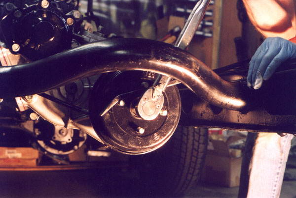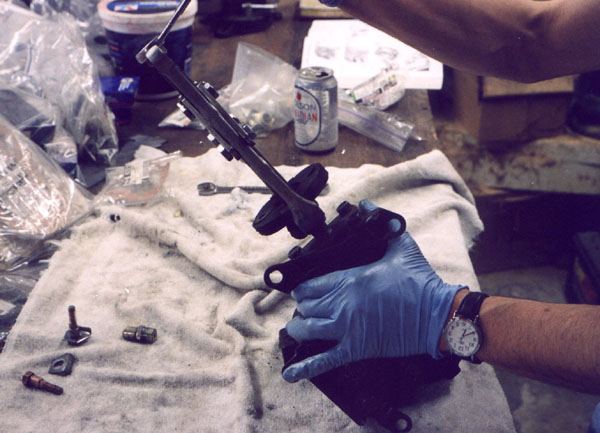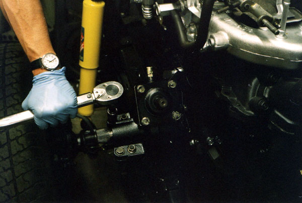 One of the last tasks was tightening down the bolts that are shared between the sector shaft retaining plate and the heat shield that goes between the box and the exhaust manifold. These photos weren't developed yet, so I had to rely on memory and common sense as to how these darn brackets were suppsed to be bolted on. The manuals are no help on the backet orientation.