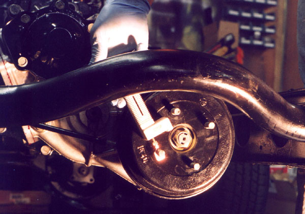 Below, the drum is installed, then the stake nut is torqued down, using a pry bar on the studs to hold the drum, then next a fish scale is used to verify proper preload on the transfer case output shaft bearings and last, the nut is staked to the output shaft.