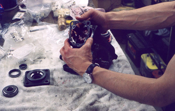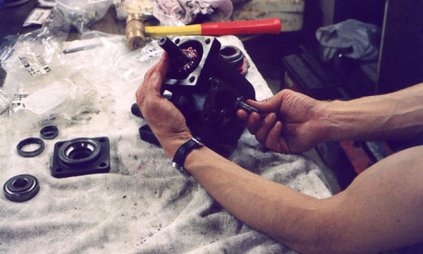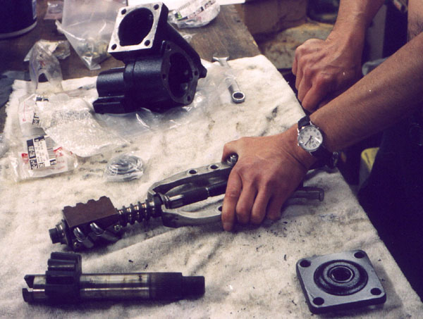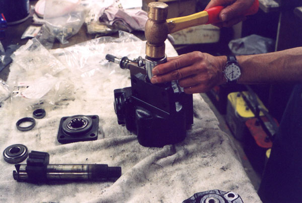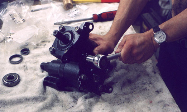 After the new race and bearing came in they were pressed onto the worm shaft. Next is putting a new sector shaft seal into the side of the box.