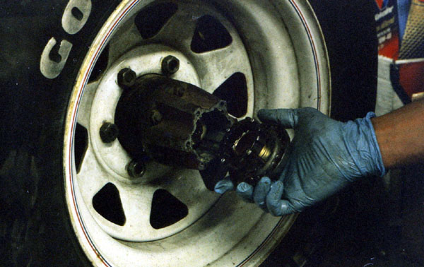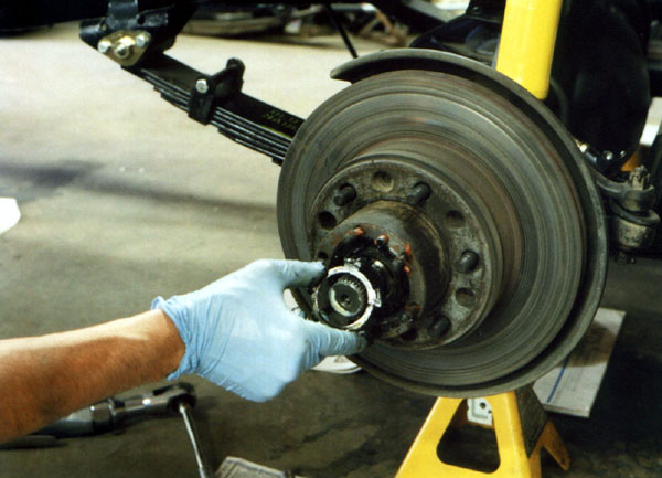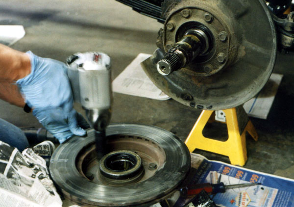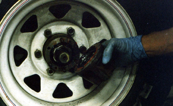 The next step, not shown, is removing the adjusting nut. Now the entire hub can be withdrawn over the spindle. The rotor is bolted to the back of the hub; it will be replaced later. I left the bearing retainer and outer bearing on, they are easier to remove by simply pulling the hub off.