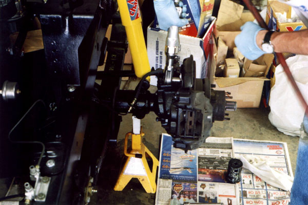 Next I put the cruiser up on jackstands and take off the wheels. There is a view of the assembly on the passenger side before going farther. The next two photos shows the driver's side, already stripped down to the axle housing with the knuckle completely removed. I concentrated on making a step-by-step tutorial on the passenger side, but there are a few driver's side shots here and there.