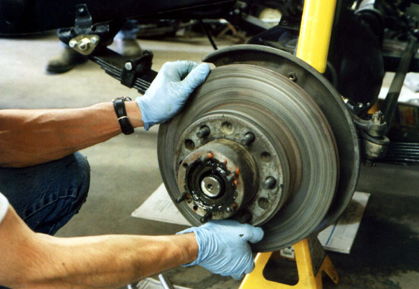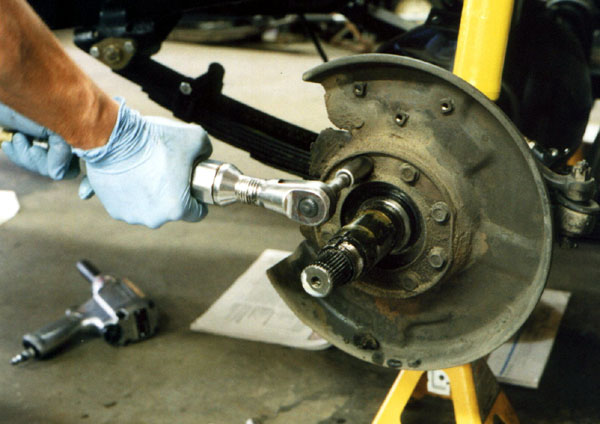 Next, the caliper can be unbolted. Often, the caliper is simply moved out of the way. When this is done, it is usually difficult to get the backing plate over the spindle, as the brake line doesn't leave much service length. If this happens to you, you can slightly loosen one of the flare fittings on the hardline to allow it to pivot a little more. If you remove the entire brake line as I did, then it comes off easy. The downside is that you have to bleed the brakes after the brake lines are reinstalled.