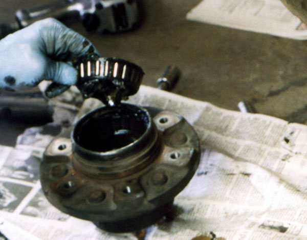 With the seal out of the way, the inner bearing can be removed. These bearings were cleaned, blown dry with compressed air, then given a thorough visual inspection. The inspection showed that they were in excellent shape and could be reused.