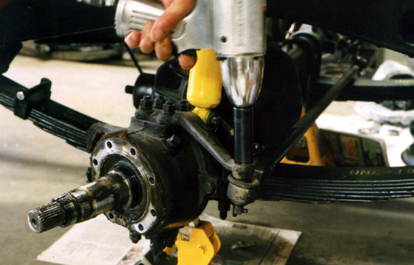 In order to replace the knuckle bearings, the steering arm must be removed. In order to do that properly, the tie rod end must be removed. First the cotter pin is removed, then the nut is removed, and last the tie rod end is separated from the steering arm with a pickle fork. The tie rod ends will all be replaced with new later in the project, so I'm not worried about messing up the rubber boot. In fact, the boots have been pretty worn out for a lot of years.