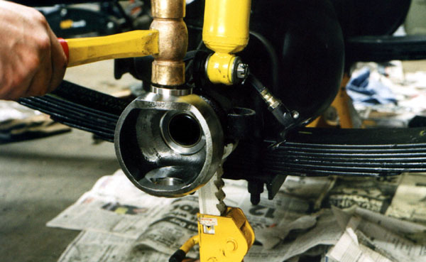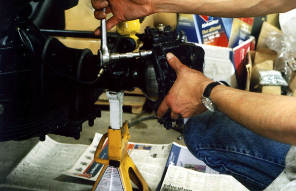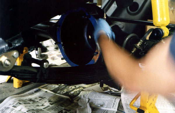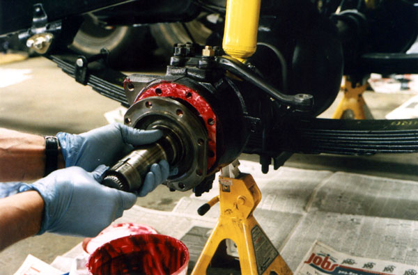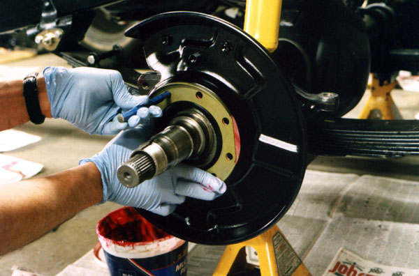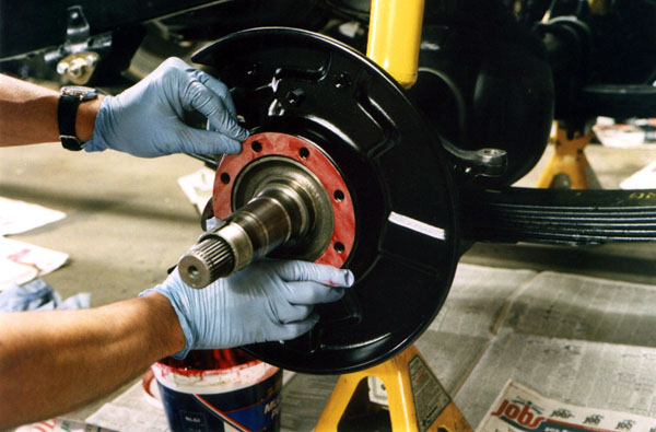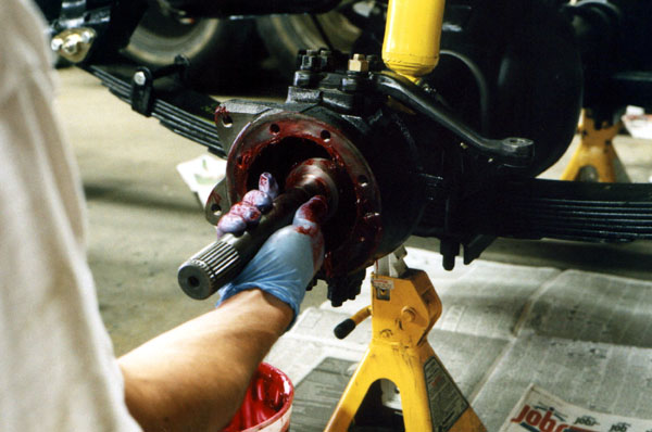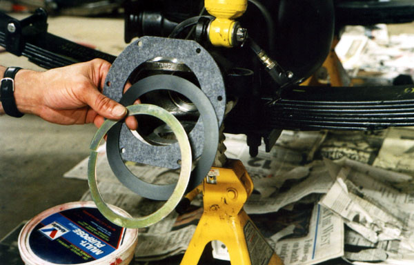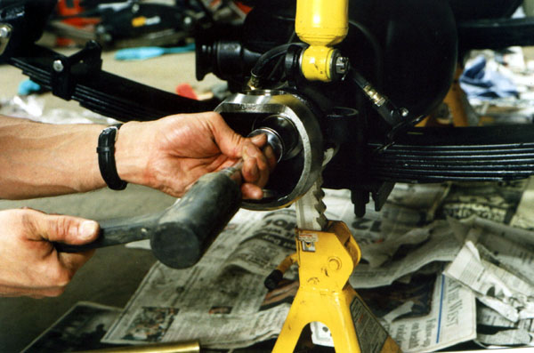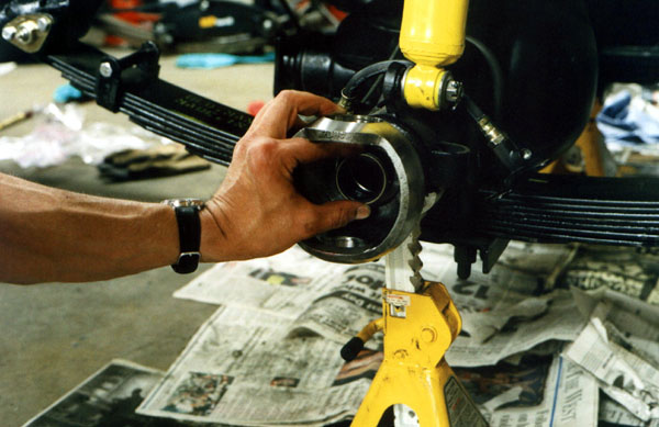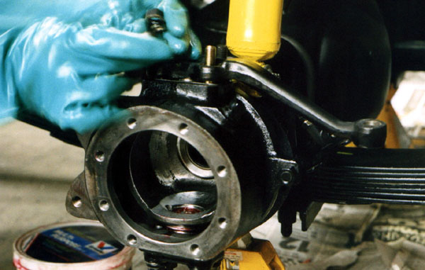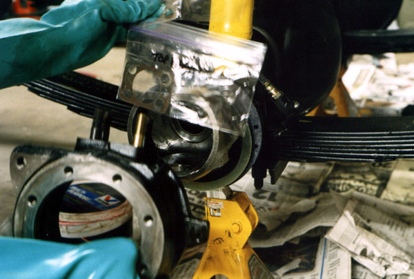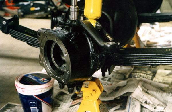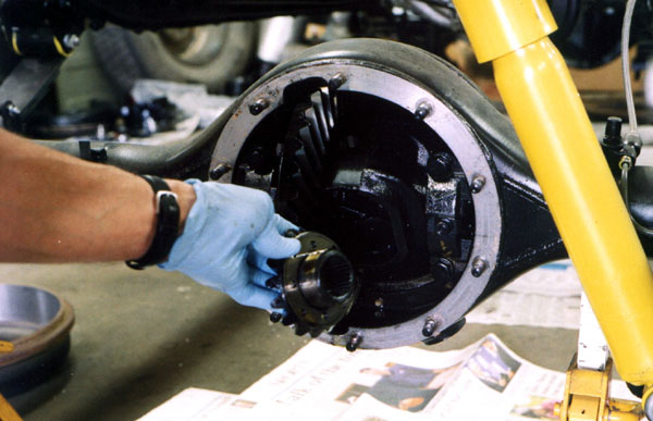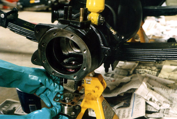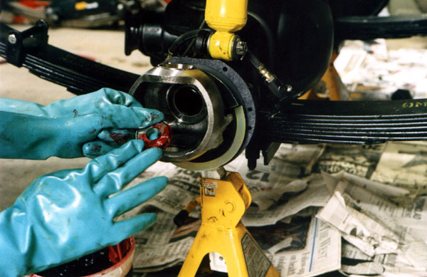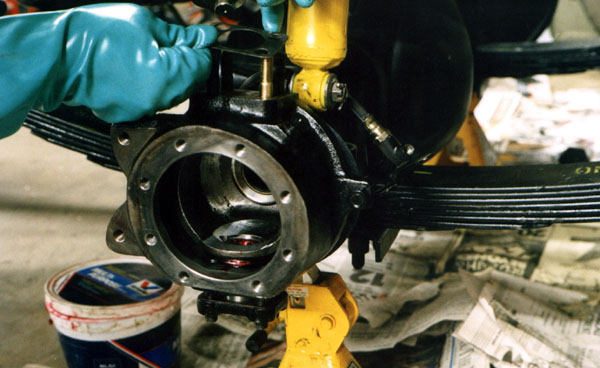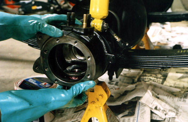 Once the bearings are in place, the knuckle is worked onto the end of the axle housing.