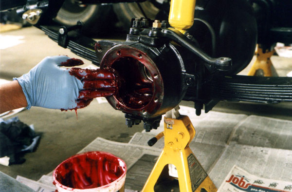 In preparation for installing the rear diff into the front, I spread a very thin coat of permatex ultra blue on both sides of he paper gasket. I have found that this helps future disassemblies go much easier.