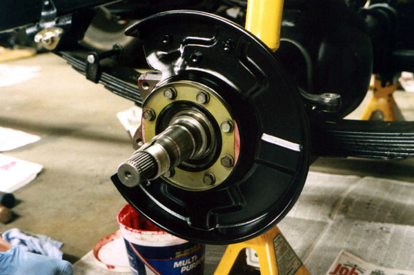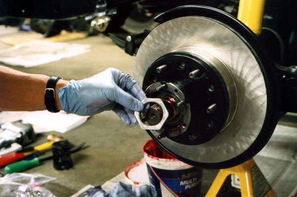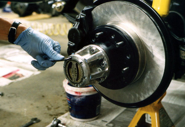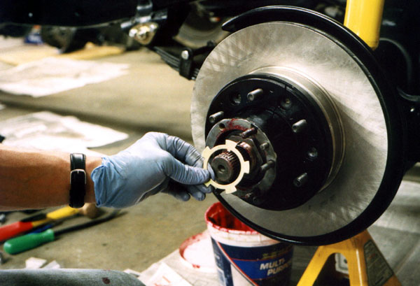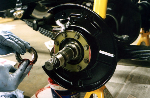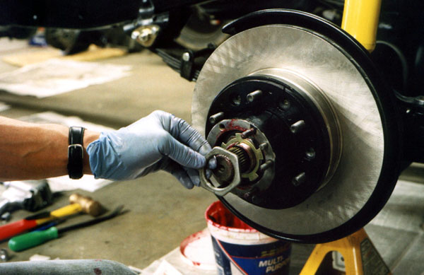 So when you need to do this procedure in the field (as in birfield repair), remember that you want to be able to tug on the wheel stud and feel about 6 and 12 pounds of resistance to hub rotation. You need to keep turning the hub while you snug the adjusting nut, this makes sure that you are displacing all but a microscopic film of grease between the bearing rollers and their races. Once you get to this preload, back off on the adjusting nut an eight turn or so, then tighten back down about the same amount while turning the hub. This makes sure that the bearing preload will hold up properly under all expected temperatures and driving conditions, and the bearing preload will still be within specifications. After you have done a bunch, you get a pretty good feel for how much force it takes to turn the hub and where to stop and then back off and back on the adjusting nut.