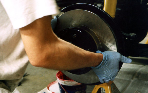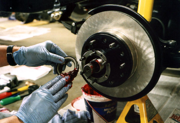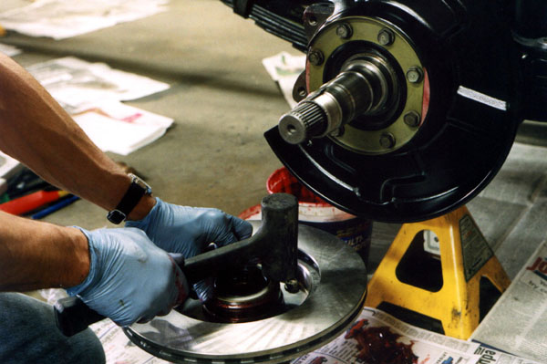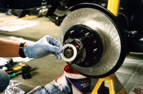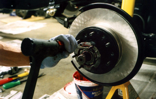 Next, below, I drive the new inner grease seal into the hub with my soft face lead filled rubber mallet, mount the hub/rotor assembly onto the spindle and then pack the outer wheel bearing with grease.