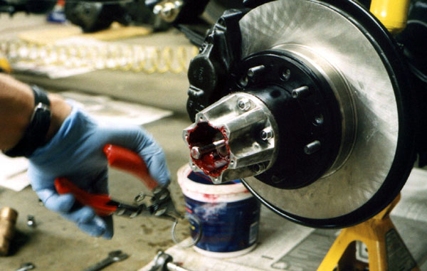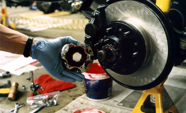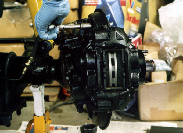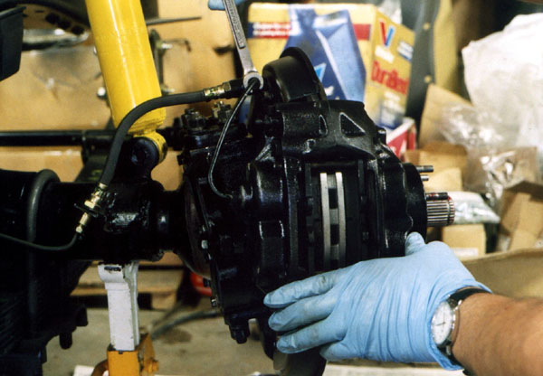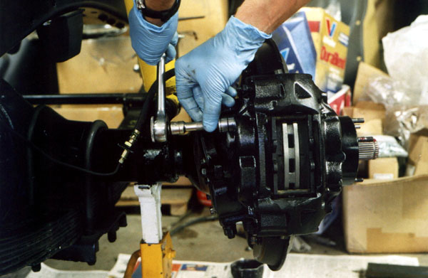 With the hubs and rotors installed, the calipers can be bolted up along with the brake line brakets. I had already loaded these calipers with new OEM pads and they are ready to go. The lower right shot shows the proper use of a flare wrench on a brake line. The flare wrench reaches a little more than half way around the fittings and prevents the flats from rounding off when you turn the wrench.