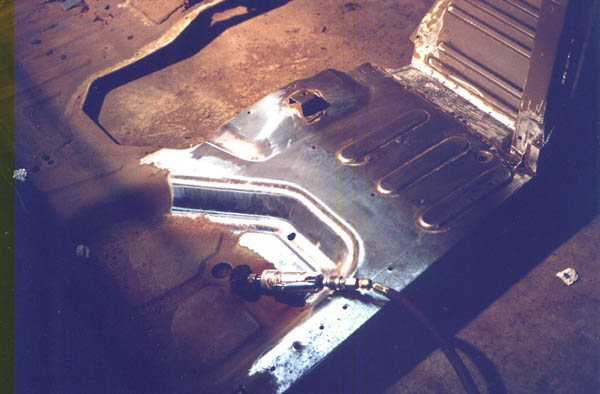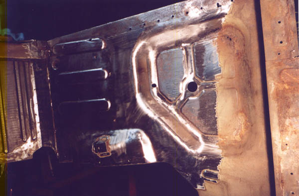 After the charred undercoating was removed, the next step is to disassemble the square box section at the rear of the floor pans. The only way to get inside it to remove the rust is to drill through the factory spot welds. I used a 5/16" bit, and it was pretty tough. The spot welds are hardened from the welding process and were not easy to drill through. Well after this photo was taken, I discovered (shoulda known) that the proper way to do this is to start out with a small bit, 1/16", then work up to 3/16" then the final size. I drilled a lot of these out the slow ay until I figured out the faster way.