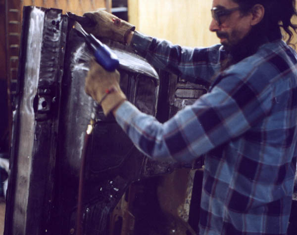Next I start on the underside. For the most part I use the 3M abrasive wheel, and am able to expose the bright, shiny steel under the paint. The nooks and crannies will have to be sandblasted later, particularly in areas such as under the body mounts.