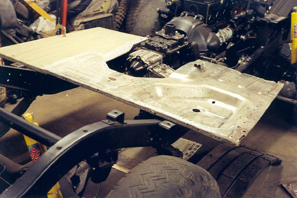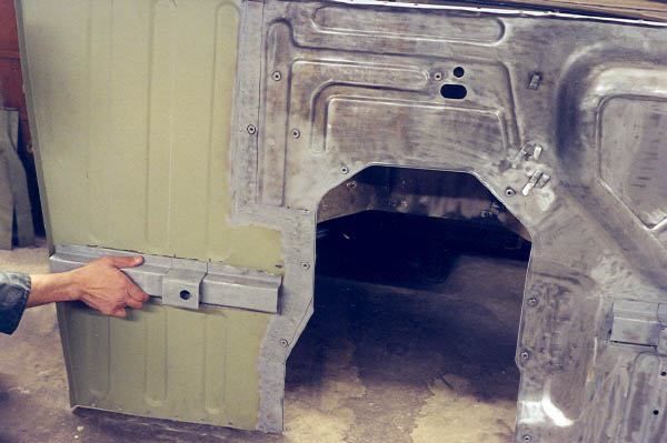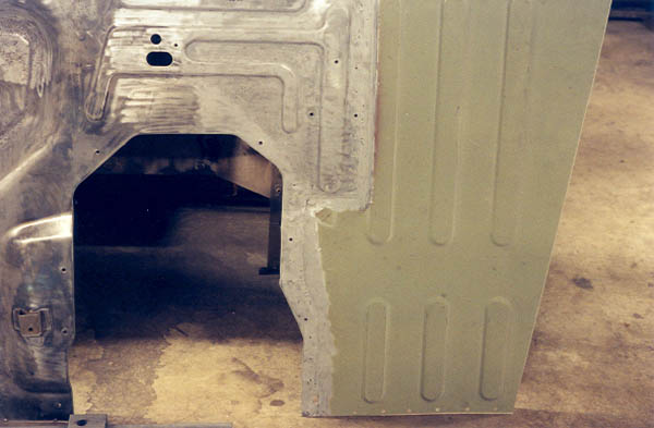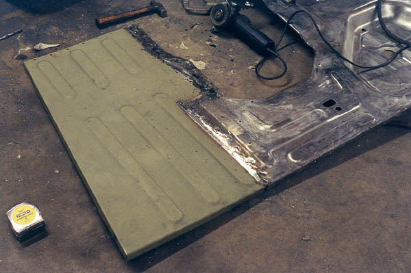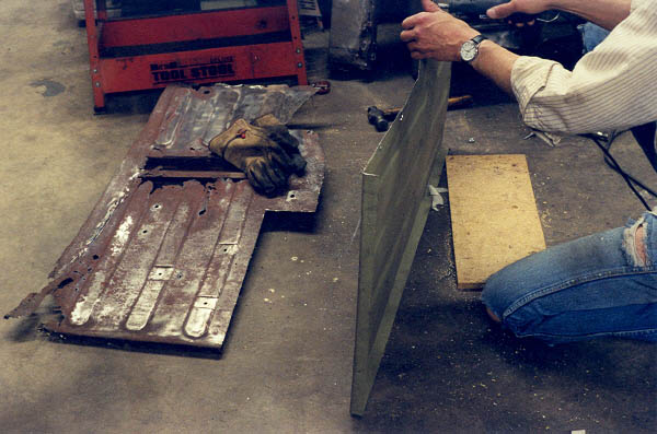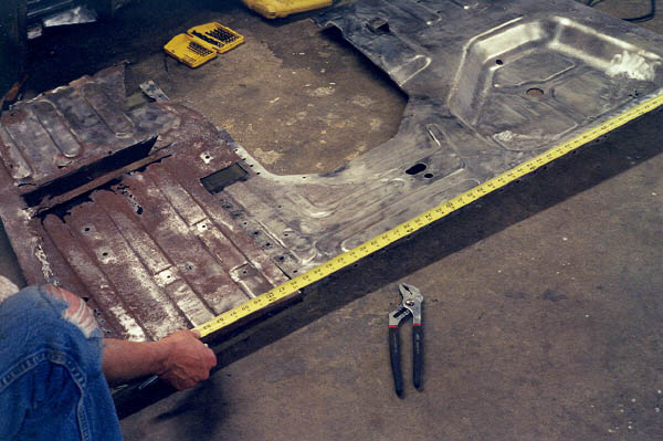 Knowing that this would be a very important fit for the whole rest of the body, I got out the old floor pan and carefully measured. One problem was because of the rot, I had to estimate some of the dimensions. With the Stanley tape measure, I tried to get measurements to within 1/16" whenever possible, but in reality I think 1/8" is all that you can hope for. Next, the new CCOT floor pan is set next to the rest and checked for fit. I used a big sharpie pen to mark where the holes were and where everything lined up.