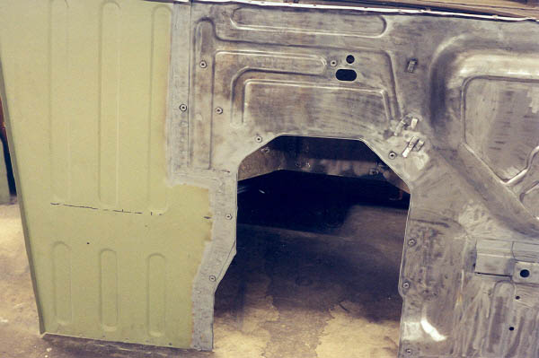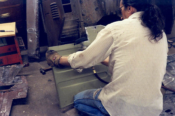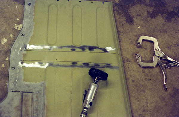 In order to get decent welds, I would have to remove the paint from the CCOT floor pan patch panel. Out came the good old 3M abrasive wheel on the air tool!