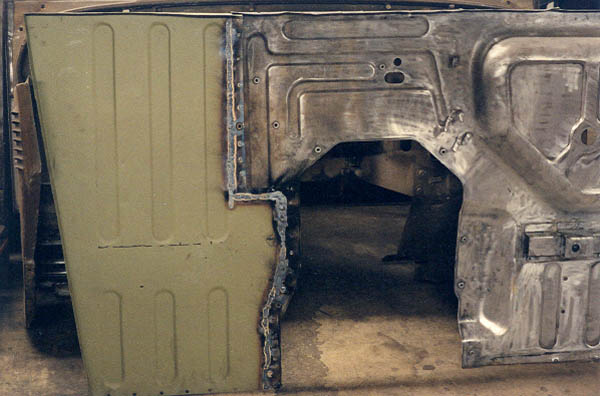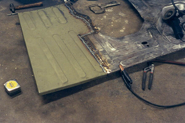 It's going good here, I have gotten away with the bead on the seam, and spot welded the next section. But you can see how the vice grips are tilted up from the start of heat warpage. But then I continue to get carried away. I did the seam bead all the way to the end of the tranny hump. It took a lot of grinding to clean up that mess, but once done, it was quite respectable. The warpage had minimal effect as it turned out to be pretty easy to straighten it out with a rubber mallet and some pices of wood. The underside shows excellent penetration with the Millermatic. Learning all the time!