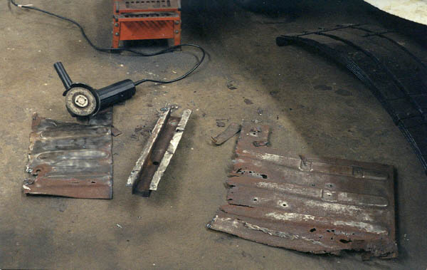 Next up was the body mount support member that goes under the driver's side floor pan. I did not want to cut this piece off until I had all my measurements and alignments for the new part welded in, so I could use the old part to reference. I cut it off with a combination of the cutoff wheel and electric angle grinder. You can see how rotted the old floor pan is, but was still clinging to a thread. Not shown, I sand blasted it inside and out.