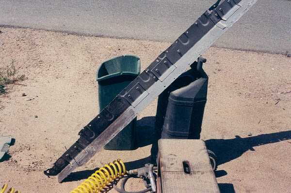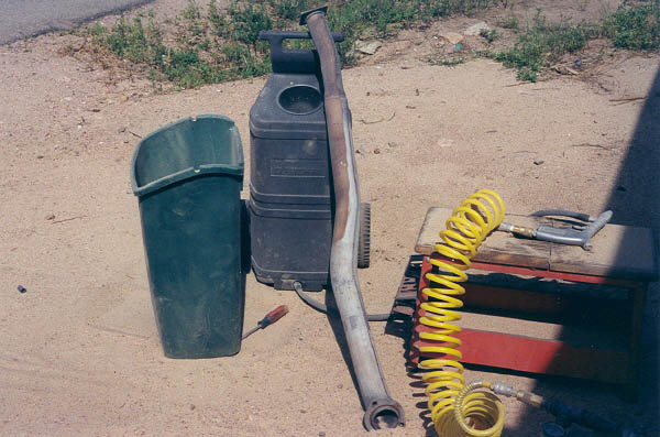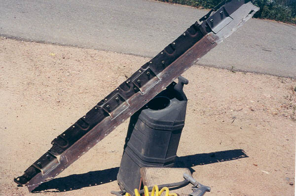 Below, I took advantage of some nice weather to get some more sand blasting done. This is the infamous "box section", which goes directly behind the seats in a 40. Actually this is one of three parts that are welded together. Some people had asked me how I was going to get the rust off the inside of these parts. Well, here's the answer: Disassemble it and sand blast down to white metal. While I was at it, I went ahead and blasted the down pipe. I would have liked to replaced it with new, but it has been discontinued and is made of unobtanium. Other than a few dents, it's actually not in too bad shape. The factory stock unit is far more desirable than any aftermarket muffler shop offering, as it is double wall and radiates much less heat and noise as a result.