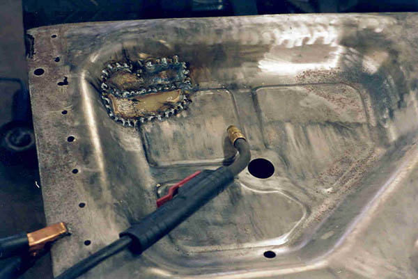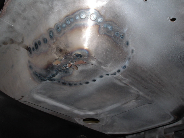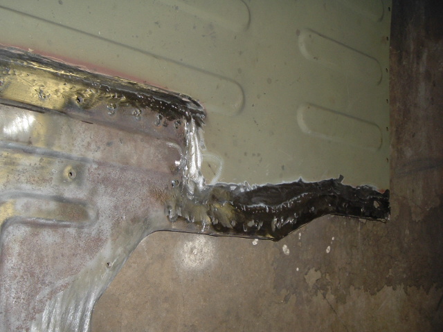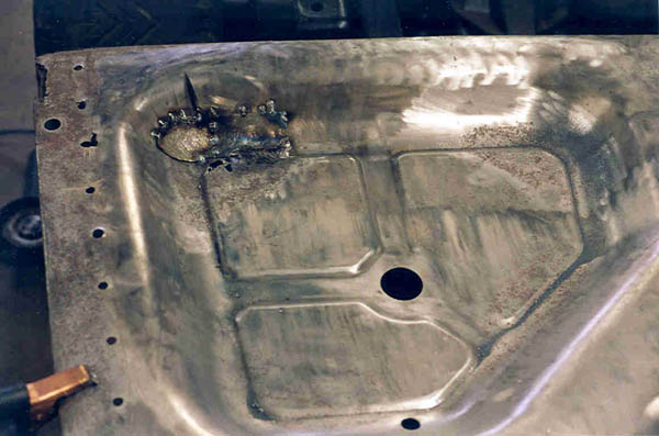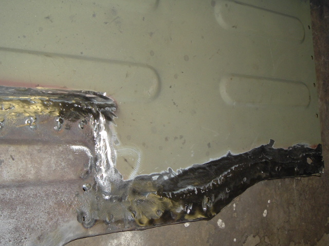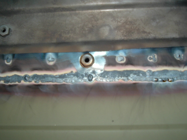 A view of the underside shows good penetration, but I have finally learned how not to blow holes through the underlying sheet metal. The perforated part of the underside in the photo on the right was left deliberately, so I could get the proper radius for the new parts above. Now that they are installed, the holes will be filled with body filler and sanded smooth, for a factory finish above and below. The other holes you see are from where I drilled through the factory spot welds for the rocker panels. When the new rocker panels are installed, I will use these holes to weld up through them, much as I did when I welded the new floor pan section on.