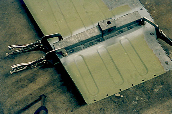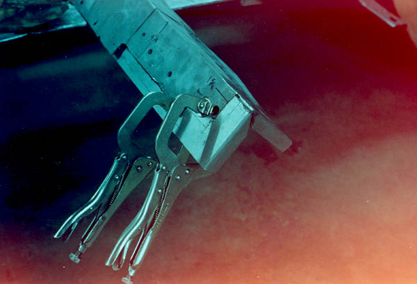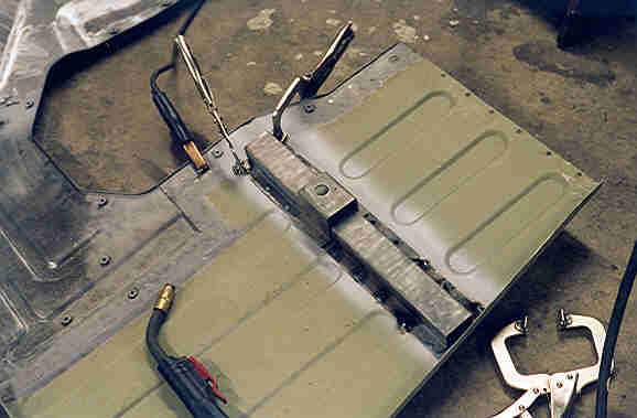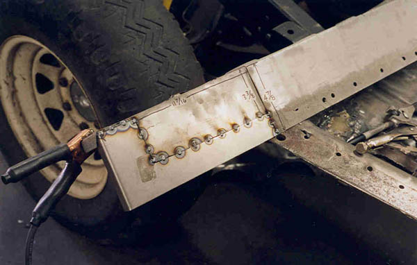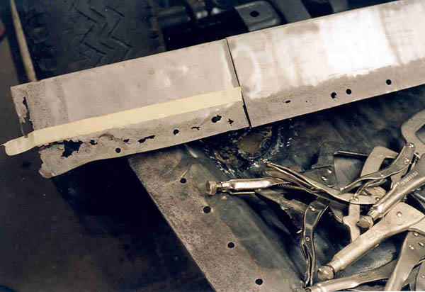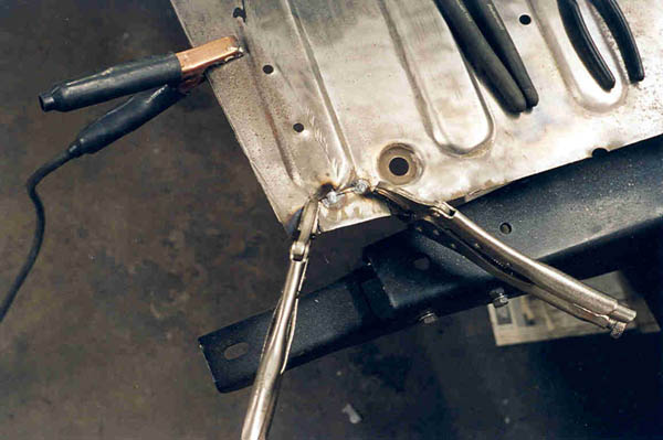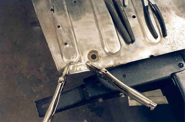 After making sure that the new piece fit perfectly, it is clamped up with the c-clamp vice grips. Note the 90 degree bend on the end which matches up with the original factory bend perfectly. After it is clamped, I carefully welded spots at intervals along the butt edge. I alternated where I welded so no one spot would get so hot as might cause any warping like I did with the floorpan. Eventually the entire edge is welded.