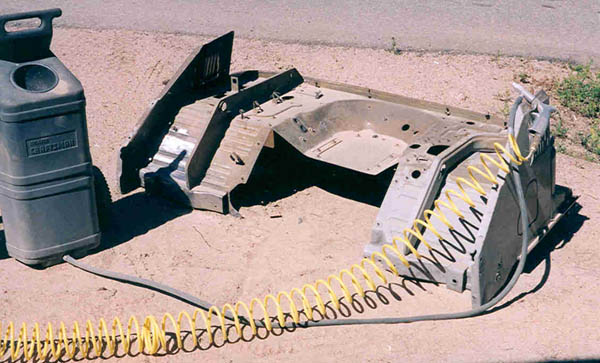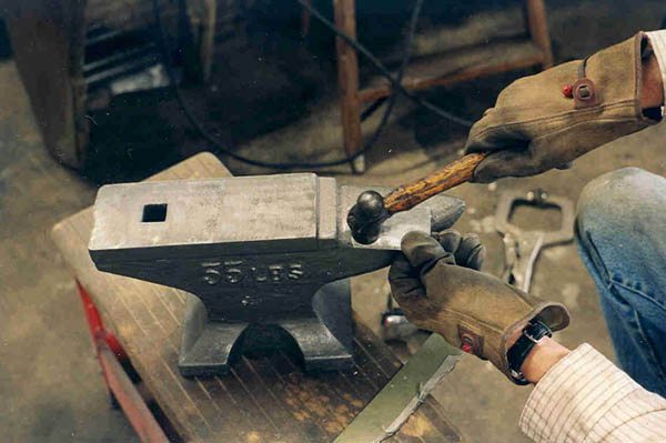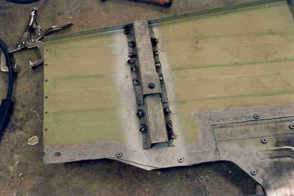 A close up. Note that instead of running a bead, I have been learning to make a number of smaller tacks. This reduces heat and warping, and once ground down, the gaps are easily filled in with body filler. This is then sanded down for a smooth finish. Final results of this will be shown on page 27. The bottom piece was made from some leftover 16 gauge from the CCOT floor pan, and still has their primer on it, sans where I tapped on the anvil. It looks a little ugly, but once ground down and filled, really works well.