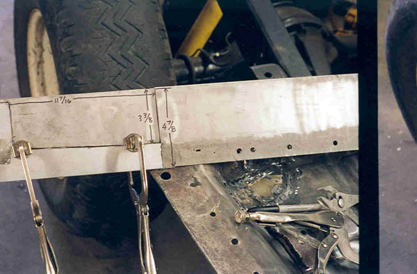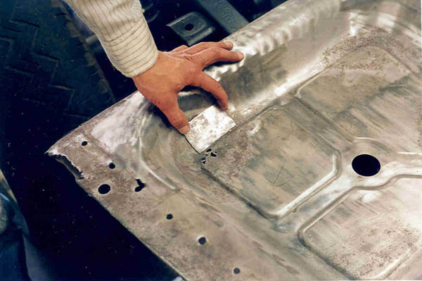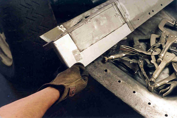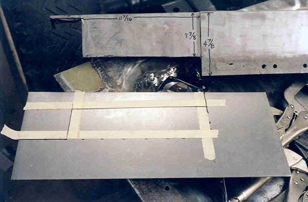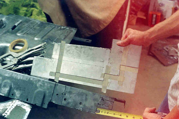 Careful measurements are taken, both of old and new dimensions, so that the replacement panel can be cut to fit. Then the new sheet metal is measured, marked and taped for cutting.