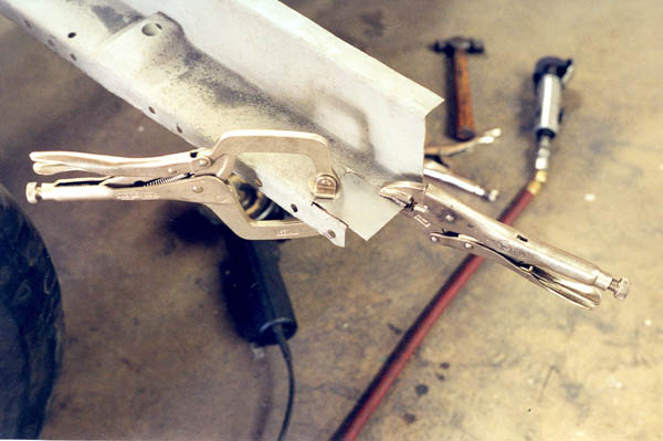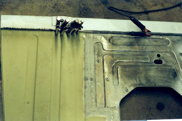 Then cut a new piece from fresh sheet metal, bend the end, clamp it in and weld it in, a spot at a time so as not to warp it. Later, the spots will be filled in closer and closer, then ground down flat.