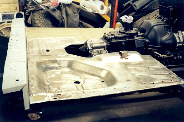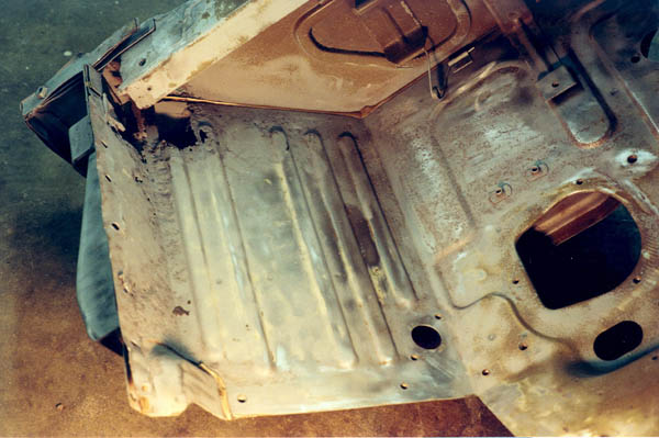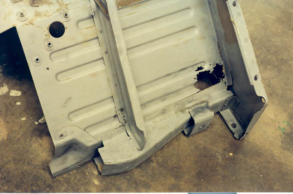 The two photos below show the cancer on the driver's side floor of the cowl that I'll be repairing shown on page 27. Similar to what's shown above, cut out the rot on straight lines, measure, cut new pieces, then weld it in. Due to the angles and hard to reach spots, this is a lot harder than the parts shown on this page.