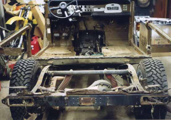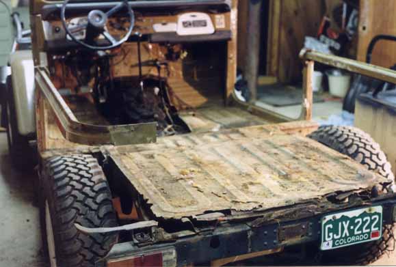 Finally got the rear bed off, revealing the rear portion of the frame. One of the two bolts for the body mounts refused to budge and had to be cut off.