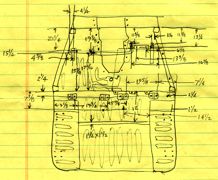 Before I totally disassembled the tub I thought it might be a good idea to measure the locations of various mounting holes. Everything from seat brackets to rear heater to fuel tank cover. There's a LOT of parts in a Land Cruiser! I figured anything more precise than +/- 1/8" was a waste of time, so that is the precision in this hand drawn picture.