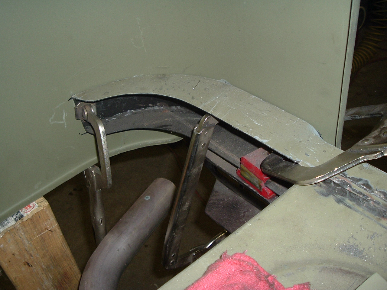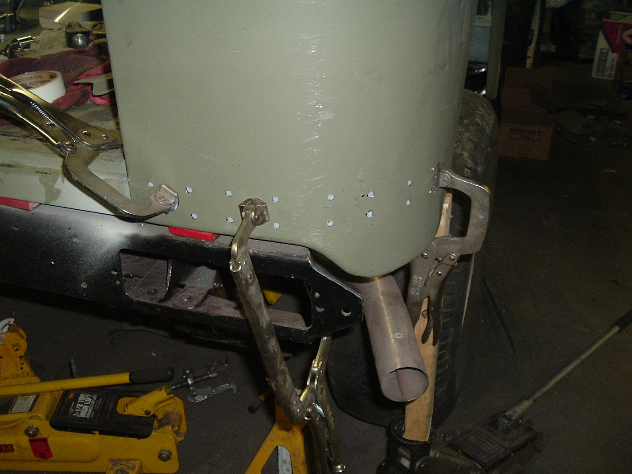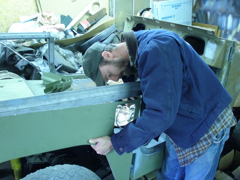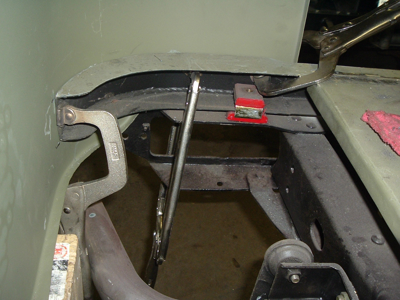 Dan checks the fit while I look for something. The quarter panels were trimmed a little bit at the top to fit where the lip was cut to make the bottom lined up just right.