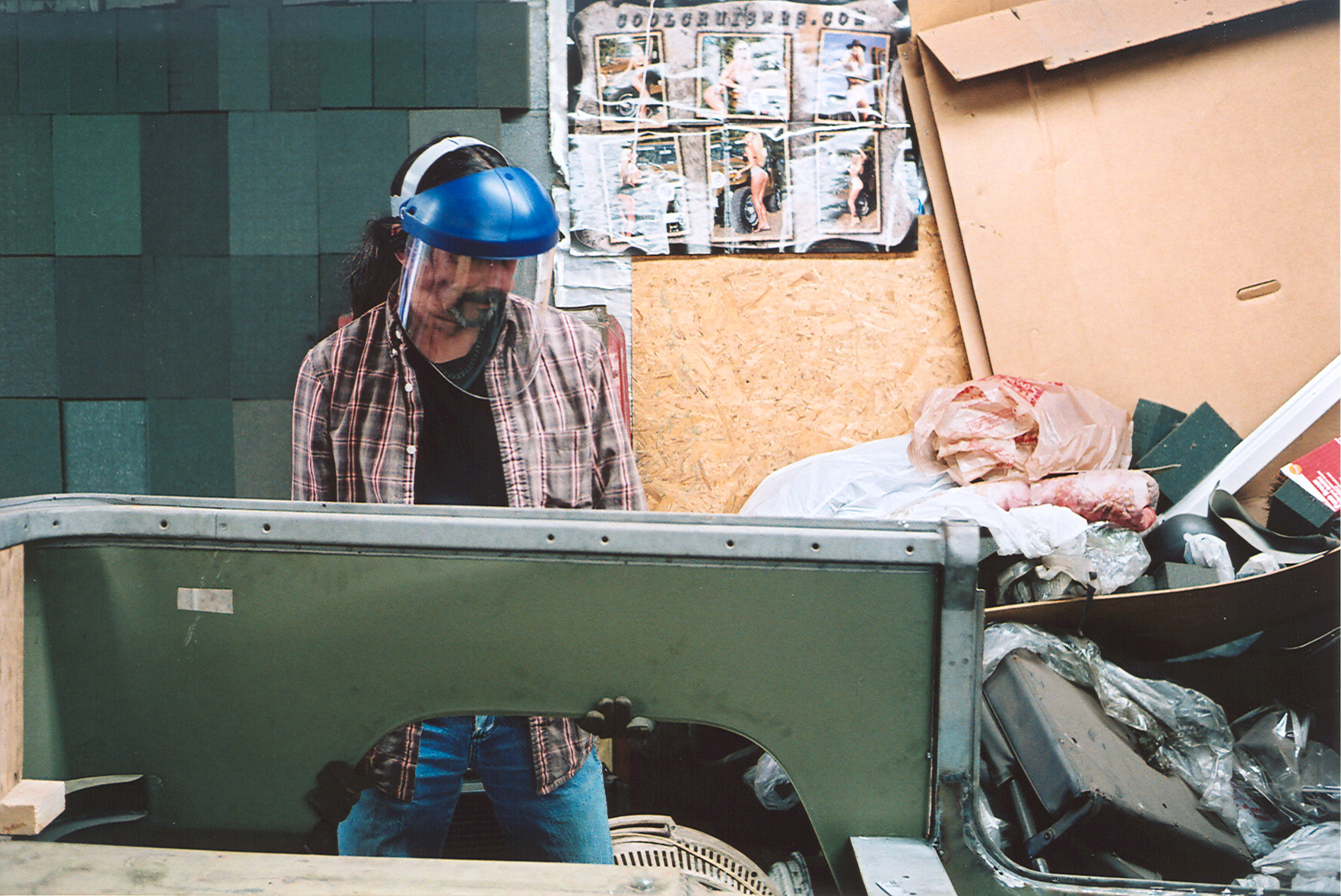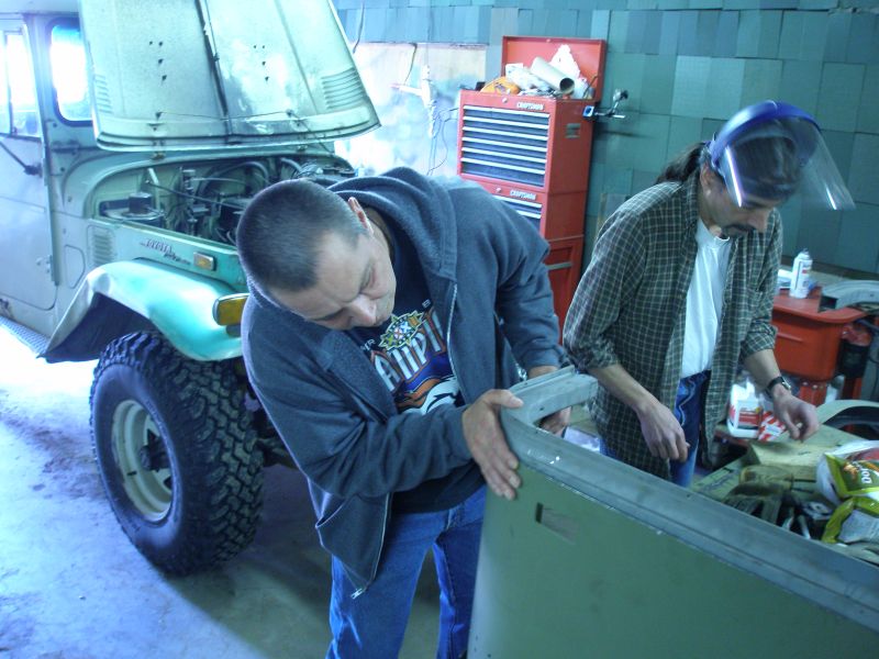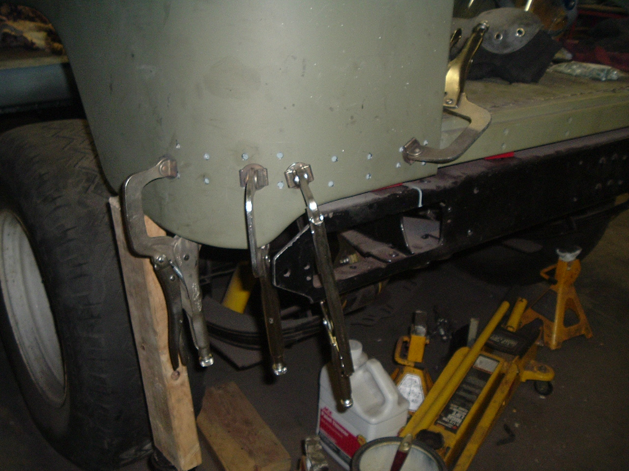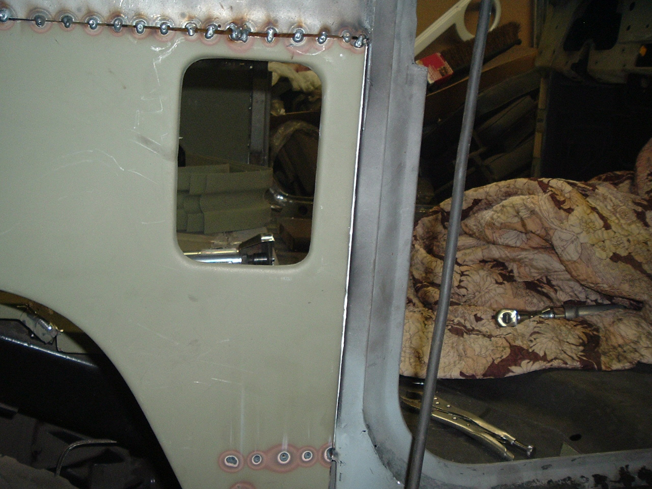 Dan checks the fit while I look for something. The quarter panels were trimmed a little bit at the top to fit where the lip was cut to make the bottom lined up just right.