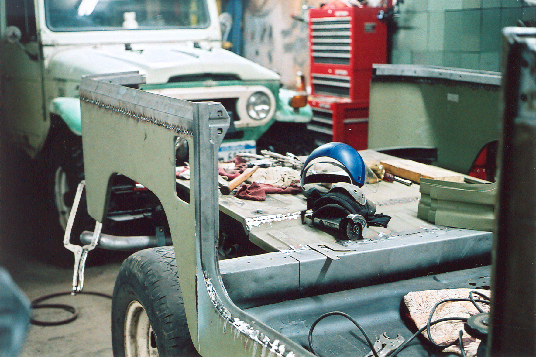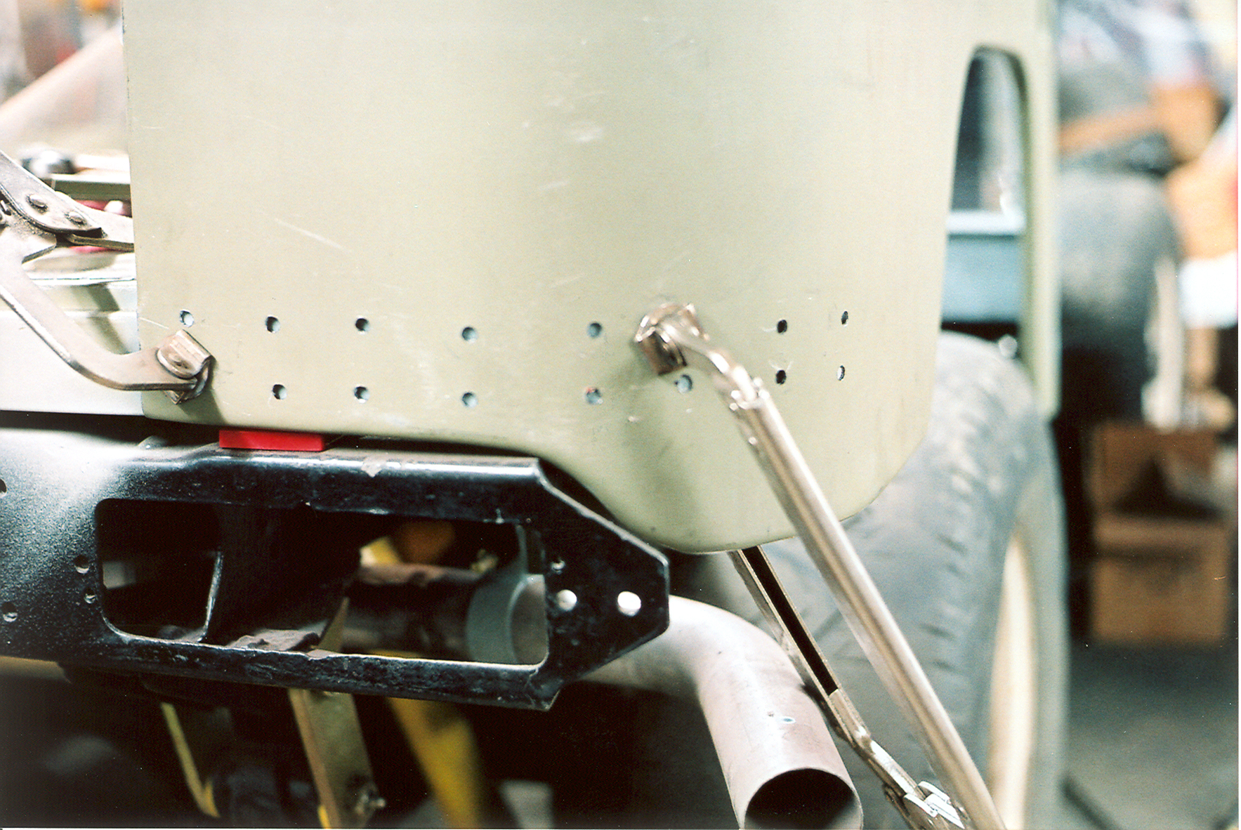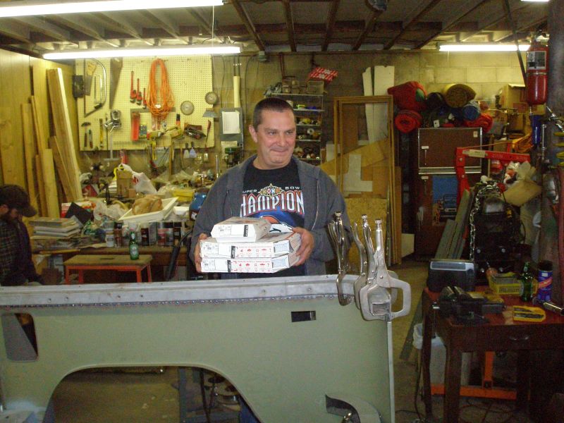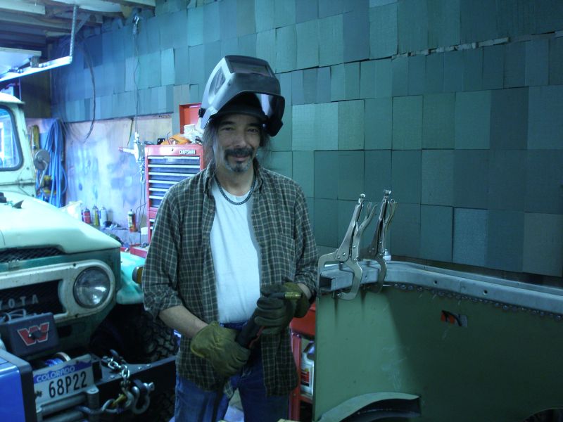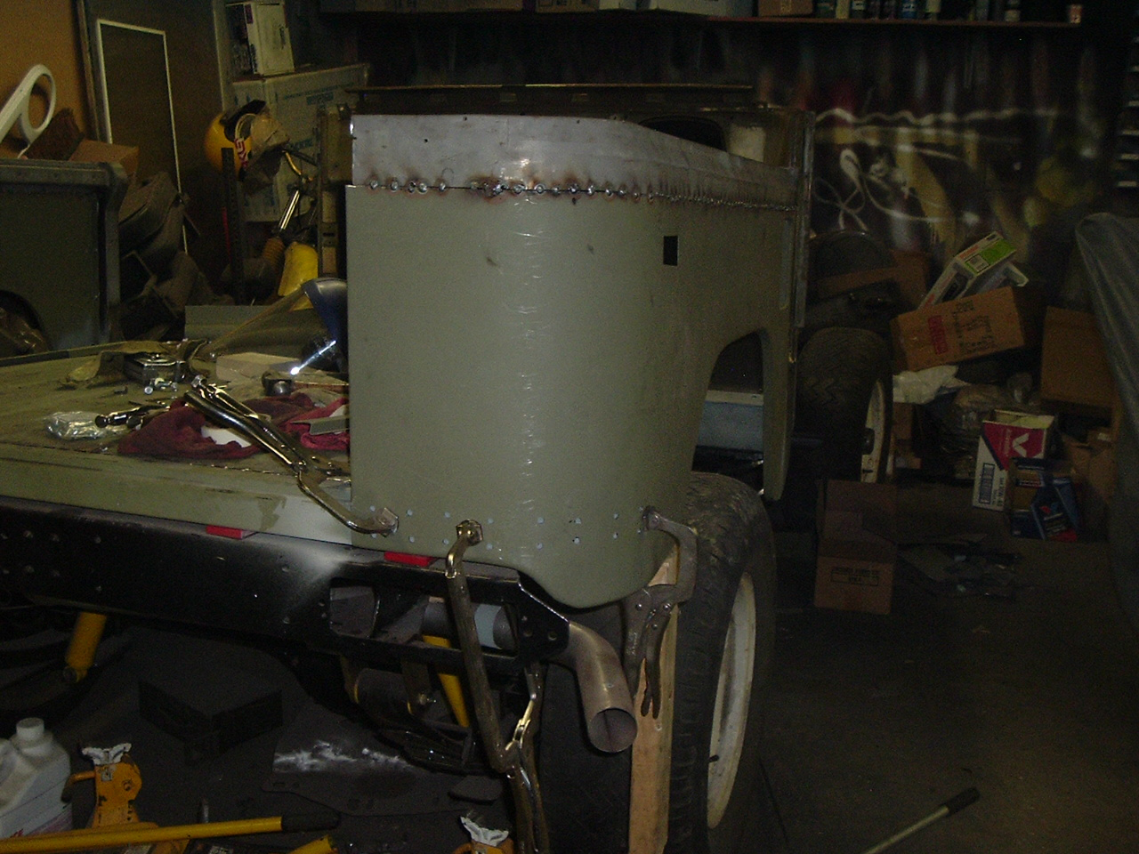 Dan checks the fit while I look for something. The quarter panels were trimmed a little bit at the top to fit where the lip was cut to make the bottom lined up just right.