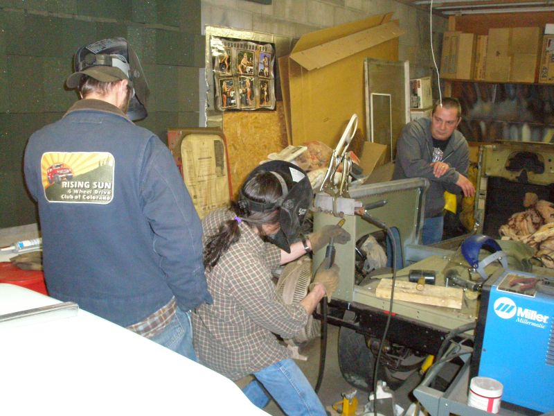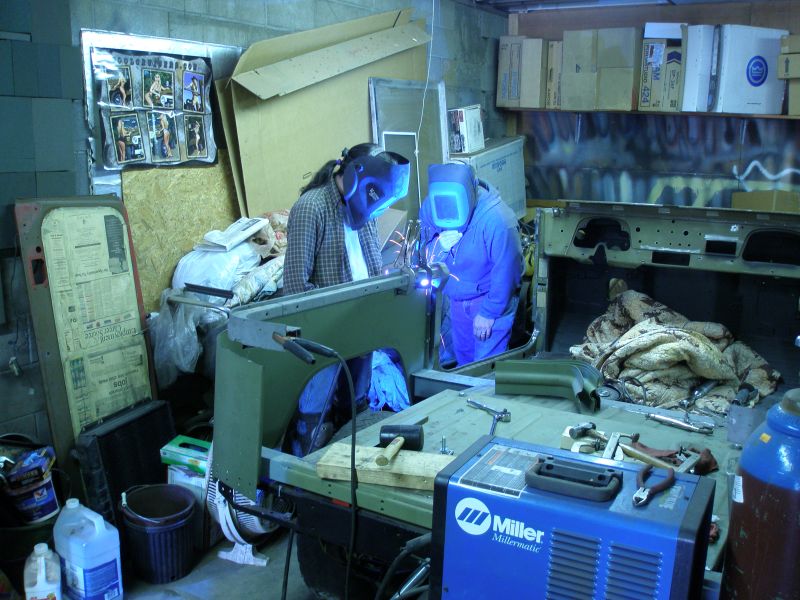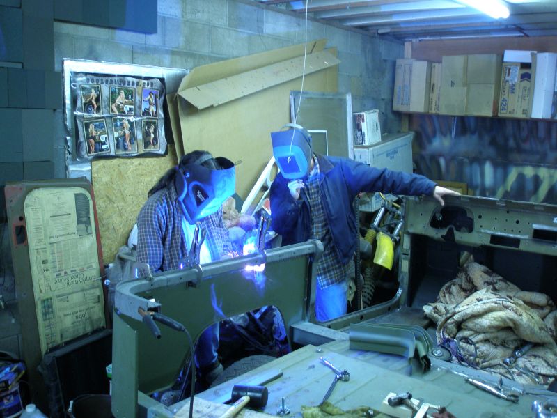 With the B pillars finally done, I could finally get going on the quarter panels! Woo hoo! I invited some friends over for a quarter panel installation party. Below is Martin Huber, left, and Dan Kucera, right.