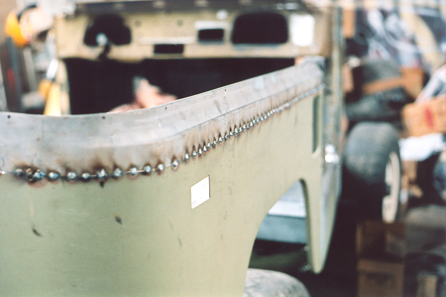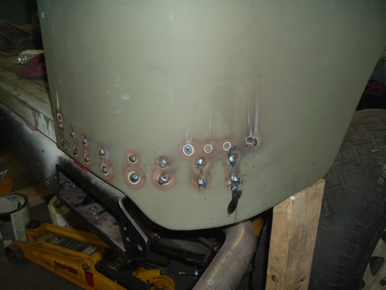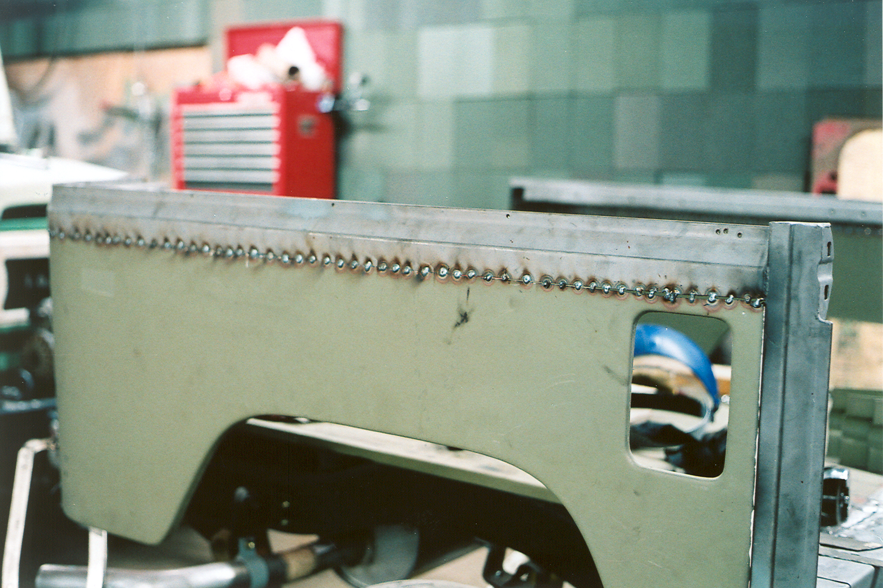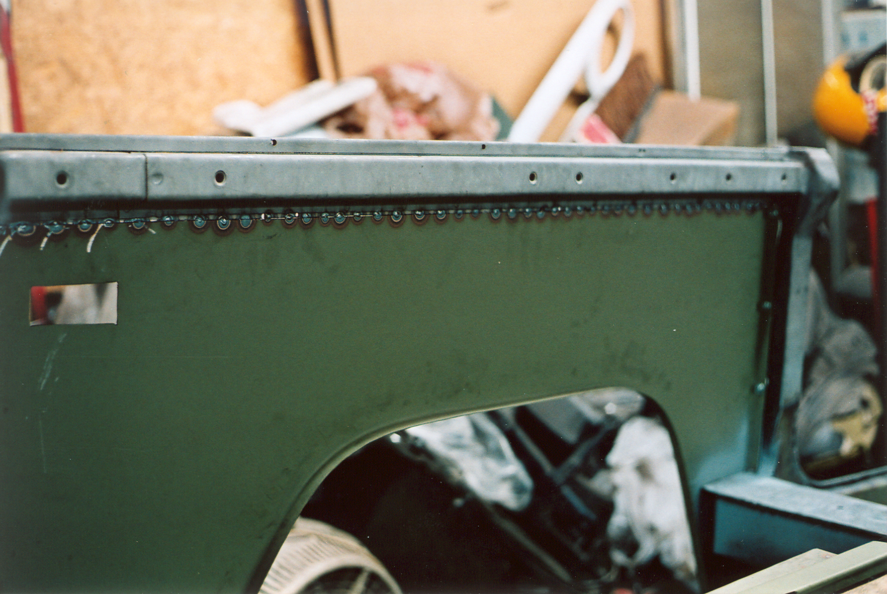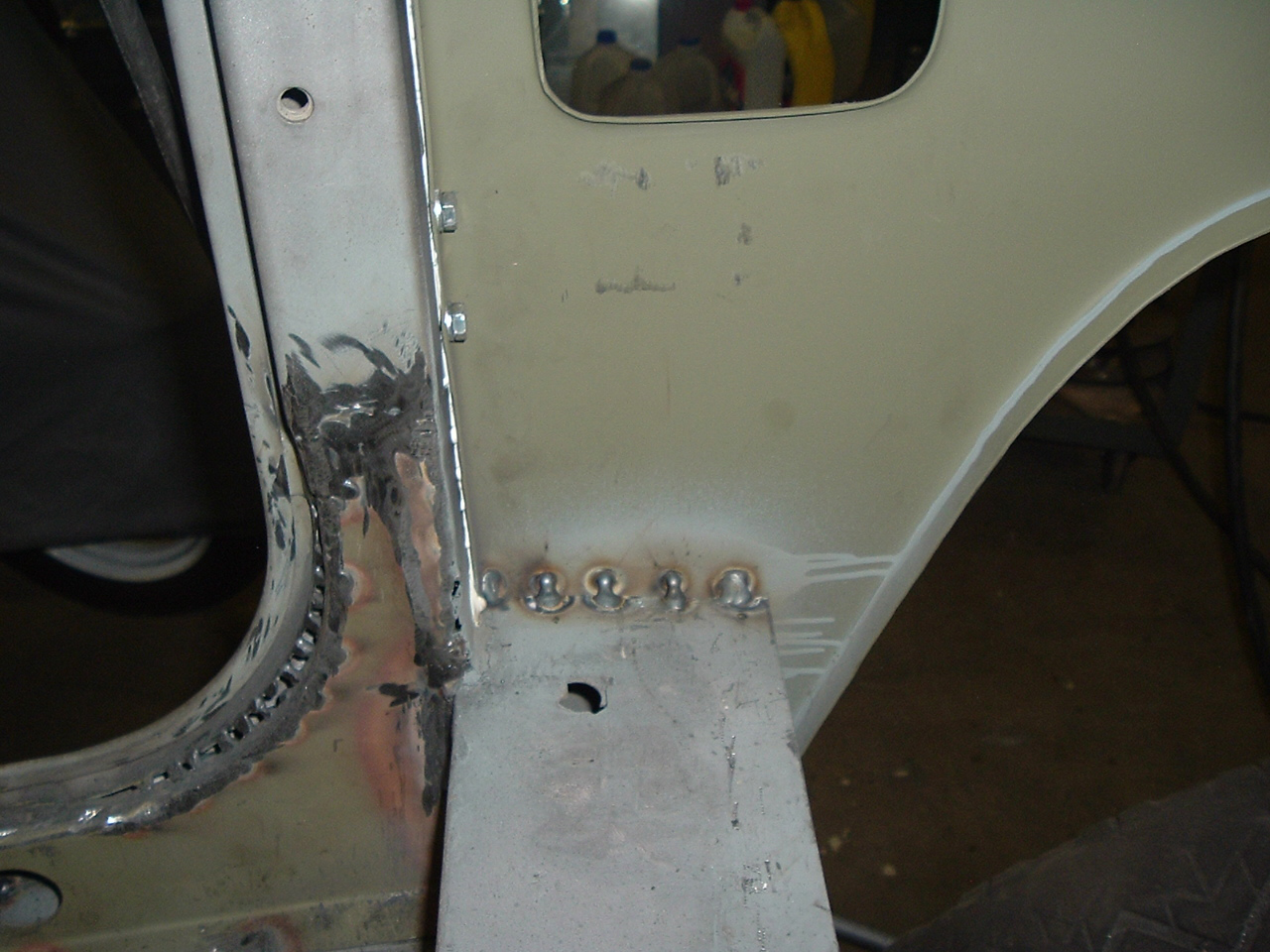 I drilled two rows of holes to weld the bottom rear of the quarter panels to the wings of the sill.