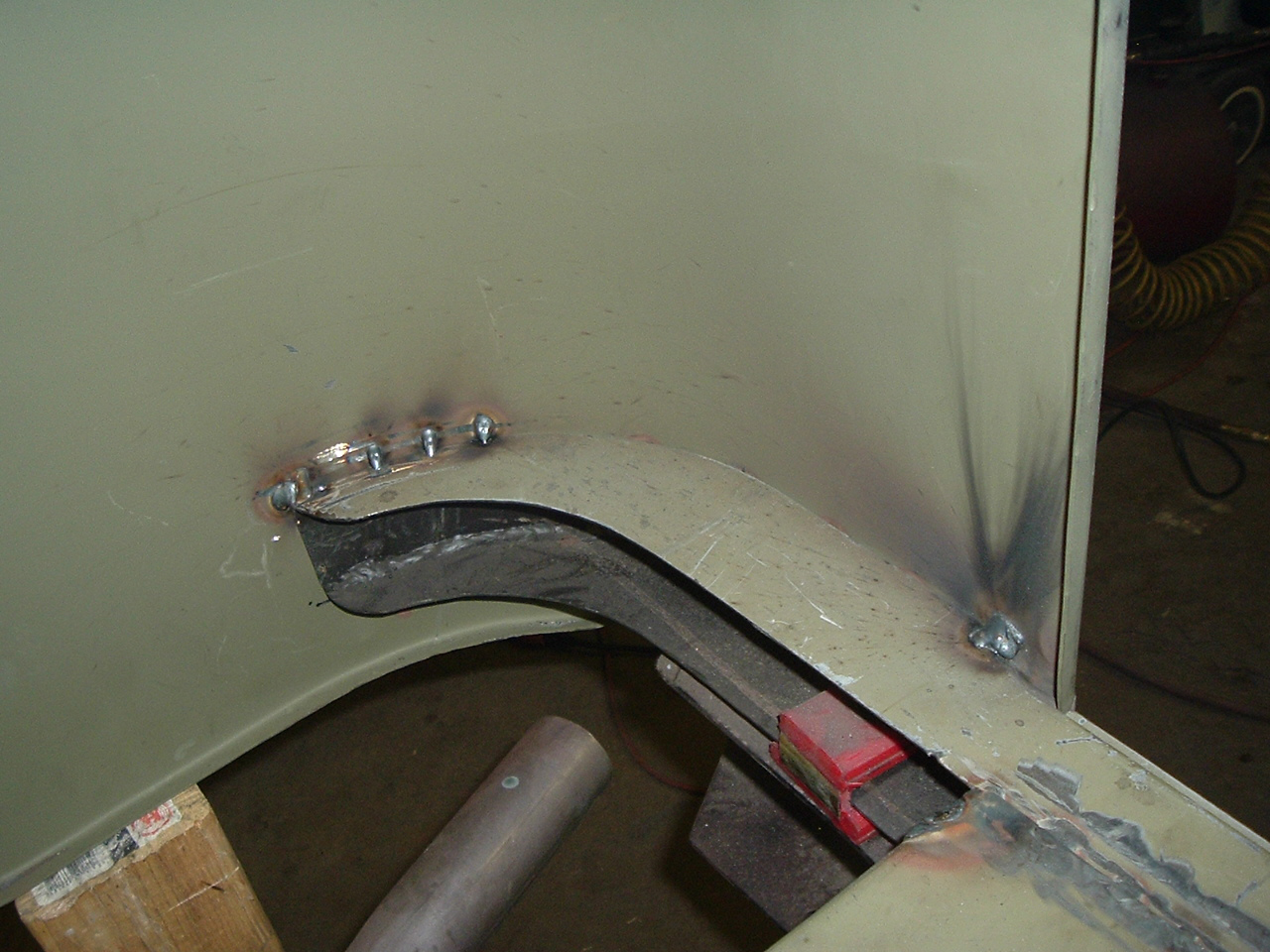 The first tack still glows yellow as I prepare to weld the next one. I started at the upper corner and worked my way along the lip.