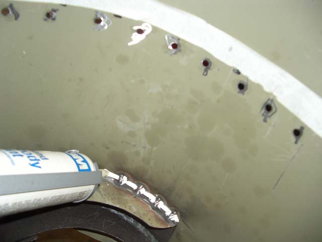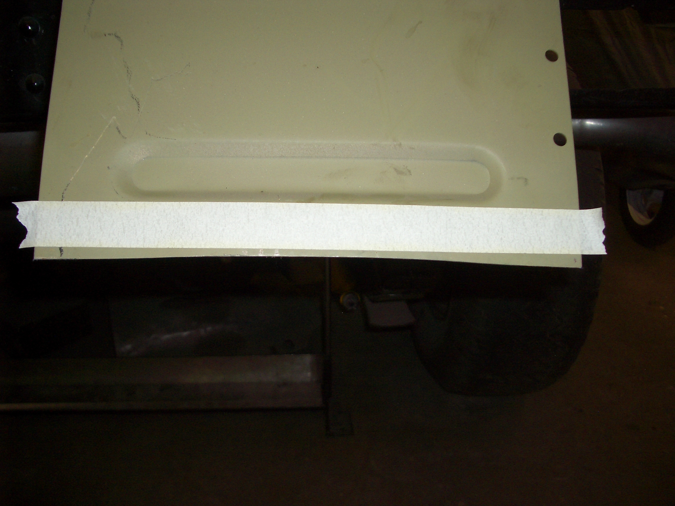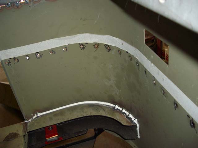 Here is where the fender well will mount to the inside of the quarter panels. I drilled holes in the quarter panels to weld through. The white stuff is 3M auto body sealant. That's to keep moister out of that seam between the quarter panel and the sill wing, one of the factory's notorious rust areas. Hopefully this will do a better job than the factory's design at preventing rust. The masking tape is to position the top of the fender well. It was measured from the underside of the quarter panel lip.