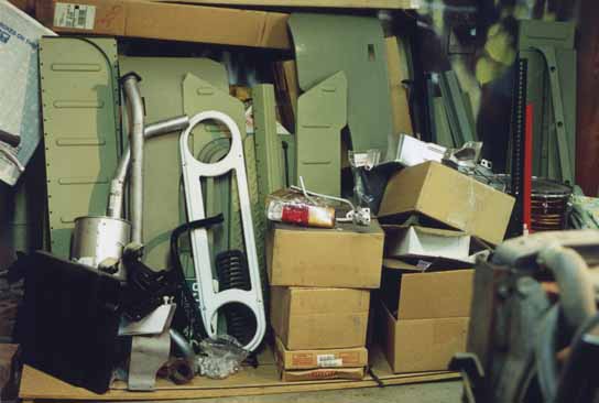 To do a project like this, you need a lot of parts. Heres a photo of my "big pile o' parts". The green sheet metal in the background is the new body parts from cool cruisers of texas, on the lower left you can see the new exhaust from Man-A-Fre, and there are dozens of parts that have been sandblasted to white metal, primed and ready for another 25 year's service...(That headlight bezel got donated to my '71, and now the '71 bezel is in the cue to be sandblasted and repainted! :-)