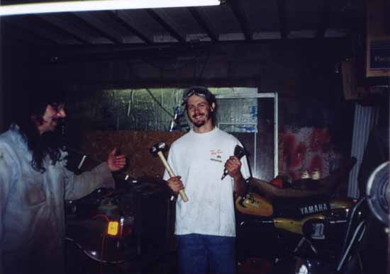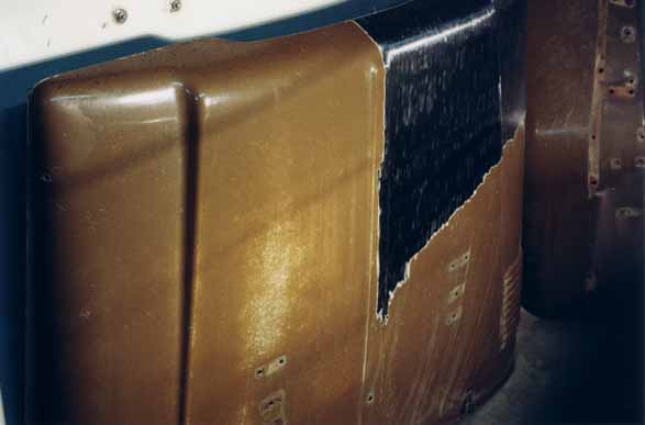 Here's a shot of the driver's side door and both aprons, stripped to bare steel but in the cue for final prep. This is a combination of sanding first, then sandblasting where you can't reach with a sander. They will each be ready to prime soon. Josh, I don't know if you remember what the box looked like, but that is the box that you shipped me those rear jumpseats in. As you can see, it is getting a much more honorable use than a 27" TV set! And yes, Ralph, I did finally get those front turn signals off. Kinda broke 'em in the process, but sometimes you do what you gotta do! LOL!