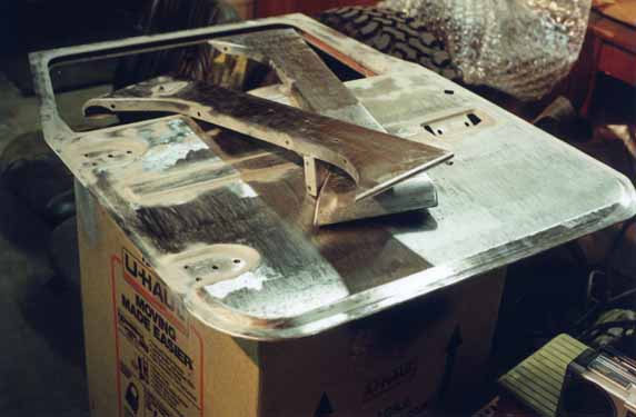 The hood pieces have been removed, sandblasted and primed, and the hood has been partially sanded...