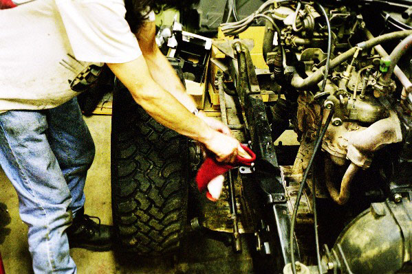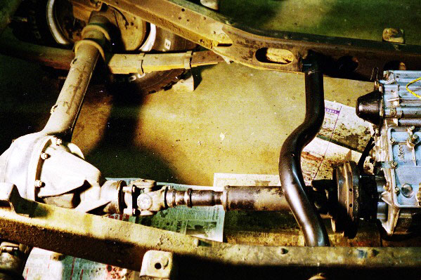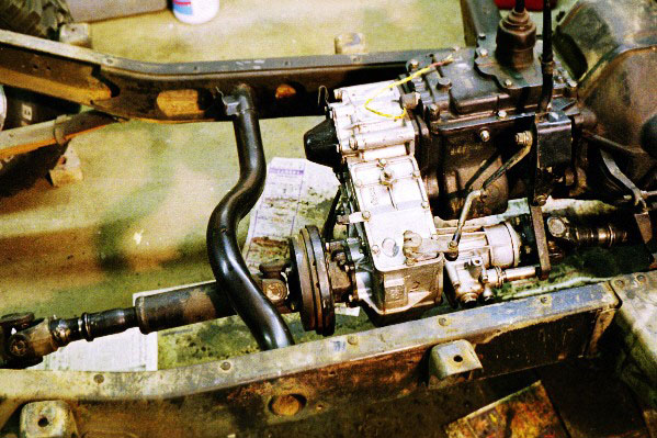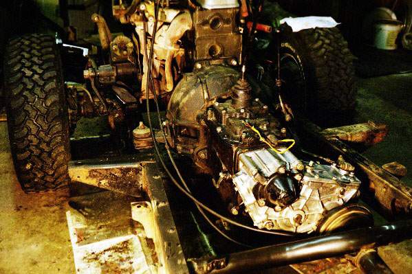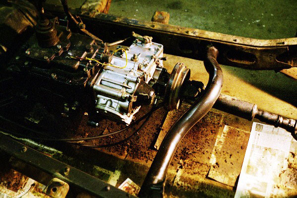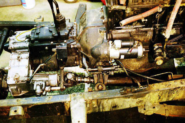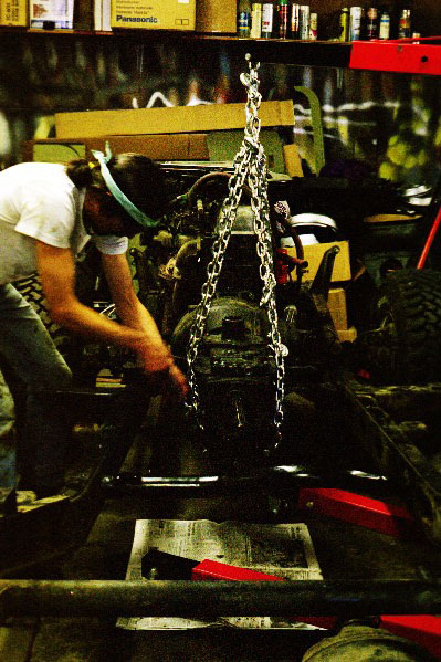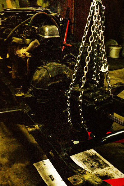 Wayne helped me remove the t-case, then the next day I set about pulling the tranny. Not totally necessary, but handy when working by yourself, the cherry picker is used to support the weight of the tranny while it is slid out from the clutch.