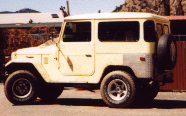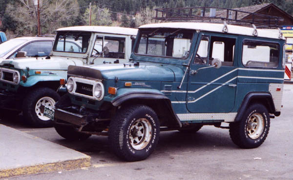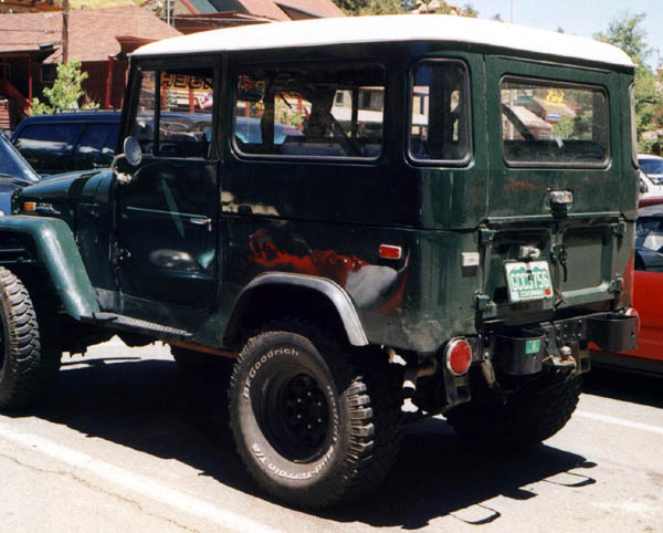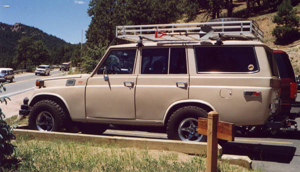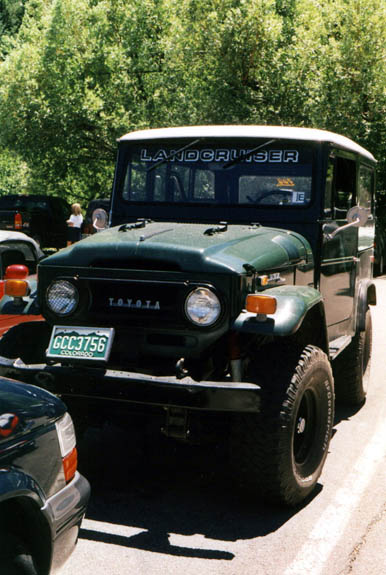 This is one of the nicest pigs I have EVER seen. These photos were taken on July 4th, 2000 at Evergreen Lake. The roof liner was some kind of silvery reflective stuff, and below it the owner had a custom fishing pole rack mounted with a number of fishing poles, so undoubtedly he was fishing at the lake. V8, 33x12.50 BFG M/Ts, alloy wheels, nice roof rack, custom front and rear bumpers, not a spot of rust, just a super clean rig. I left a note under the wiper but never heard back from the owner. Joe Calleja of Colorado Toyota Specialists (a TLCA Associate member and fellow Rising Sun member) told me that he beieved the rig belonged to a fellow named Mario, and that he had worked on the truck before. He told me that if it was the rig he was thinking of, that the V8 was an LT1 out of a Corvette. Too cool!