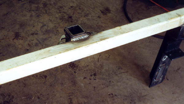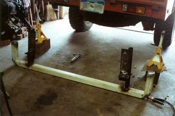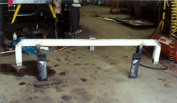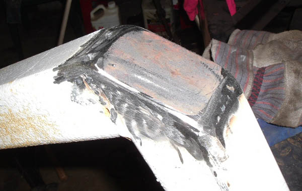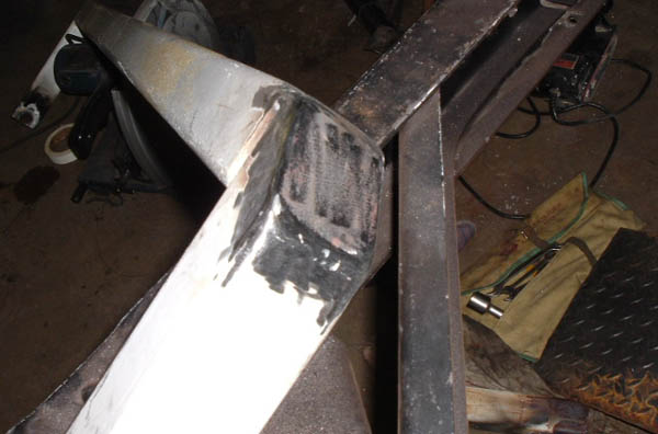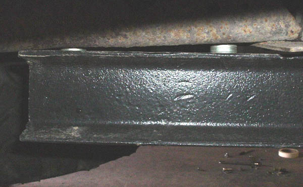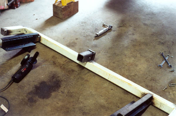 Next, I had to shim the mounts to eliminate those stacks of washers. After grinding the surface flat, I cut some pieces of steel plate and welded it on the underside to take up the gap btween the rear crossmember and the frame rails to which this would be mounted.